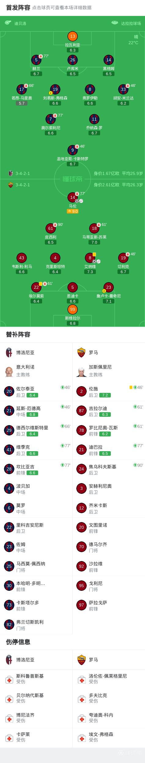 北京时间4月26日意大利足球顶级联赛第34轮,博洛尼亚主场对阵罗马。上半场马伦首开记录,艾纳维破门扩大领先优势。最终比分博洛尼亚0-2罗马。
